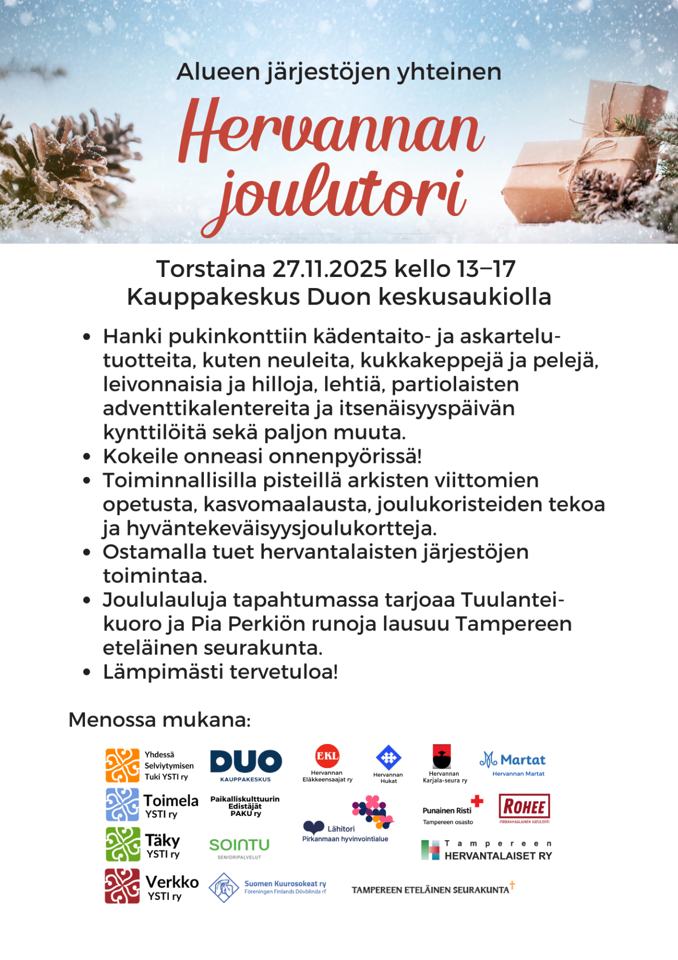Tervetuloa tapaamaan meitä ja muita paikallisia kolmannen sektorin toimijoita Kauppakeskus Duon keskusaukiolle. Ostamalla tuet yleishyödyllisten järjestöjen toimintaa.