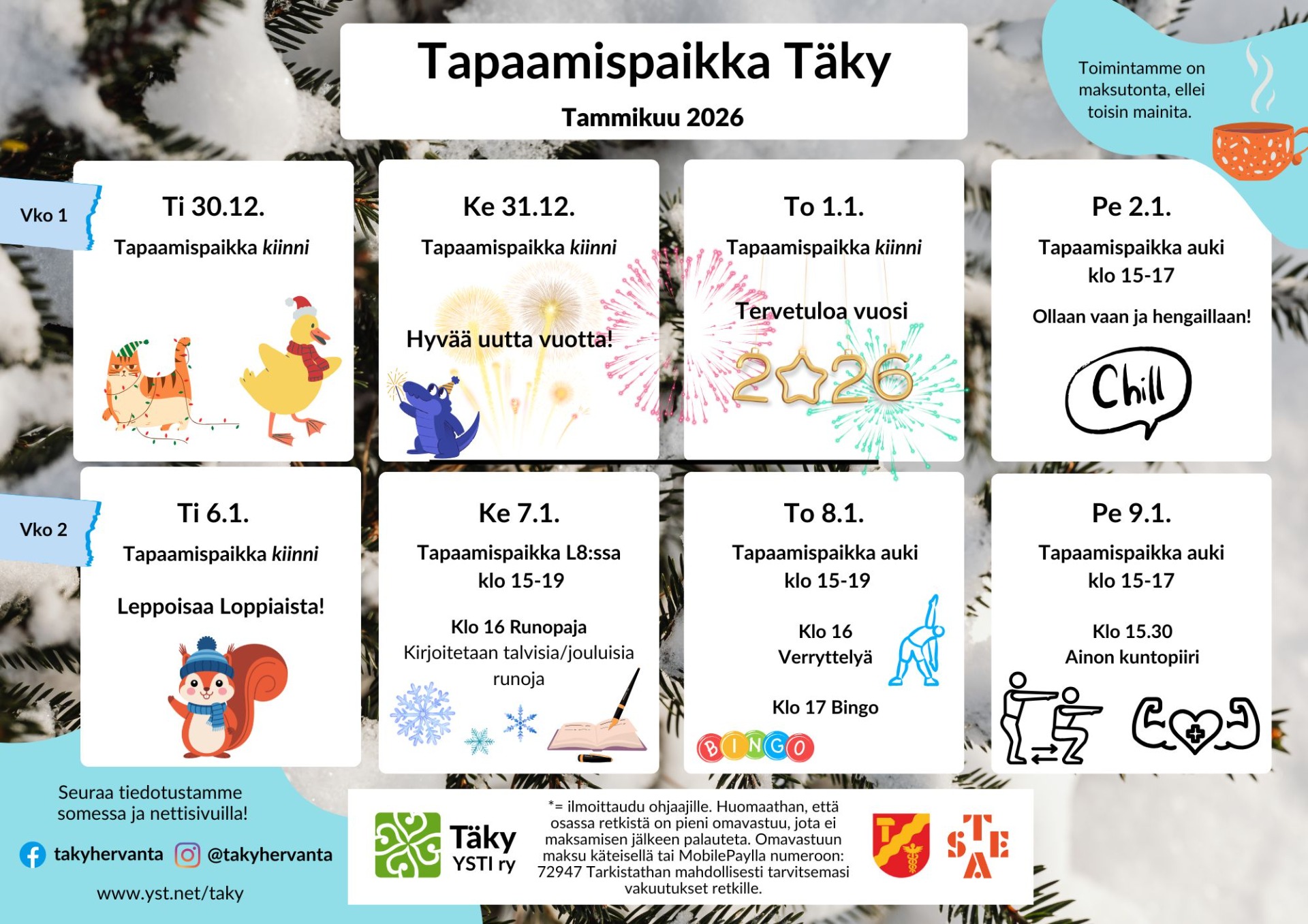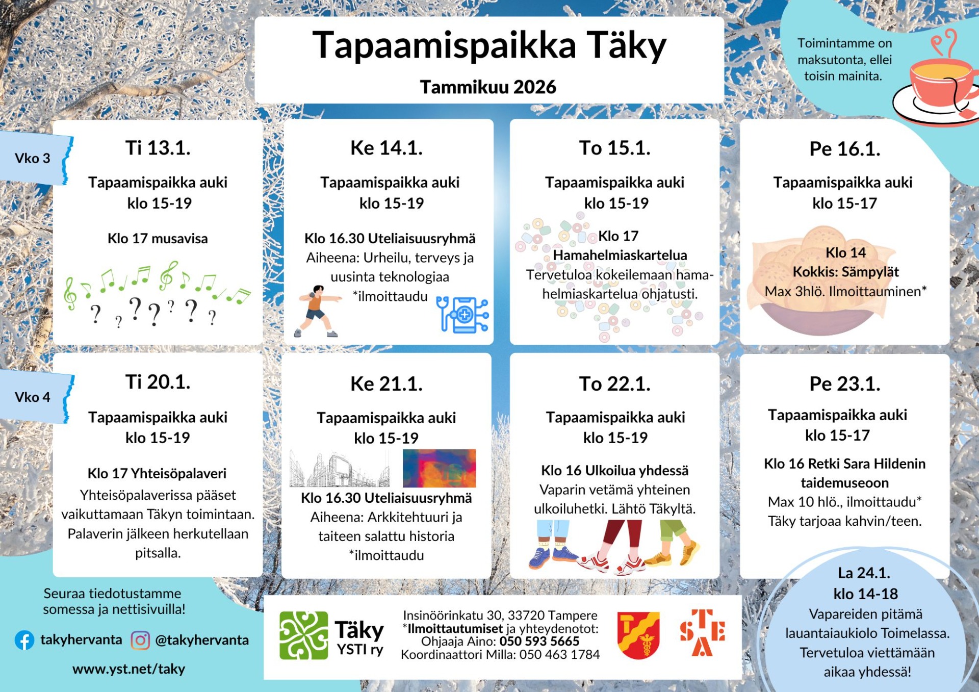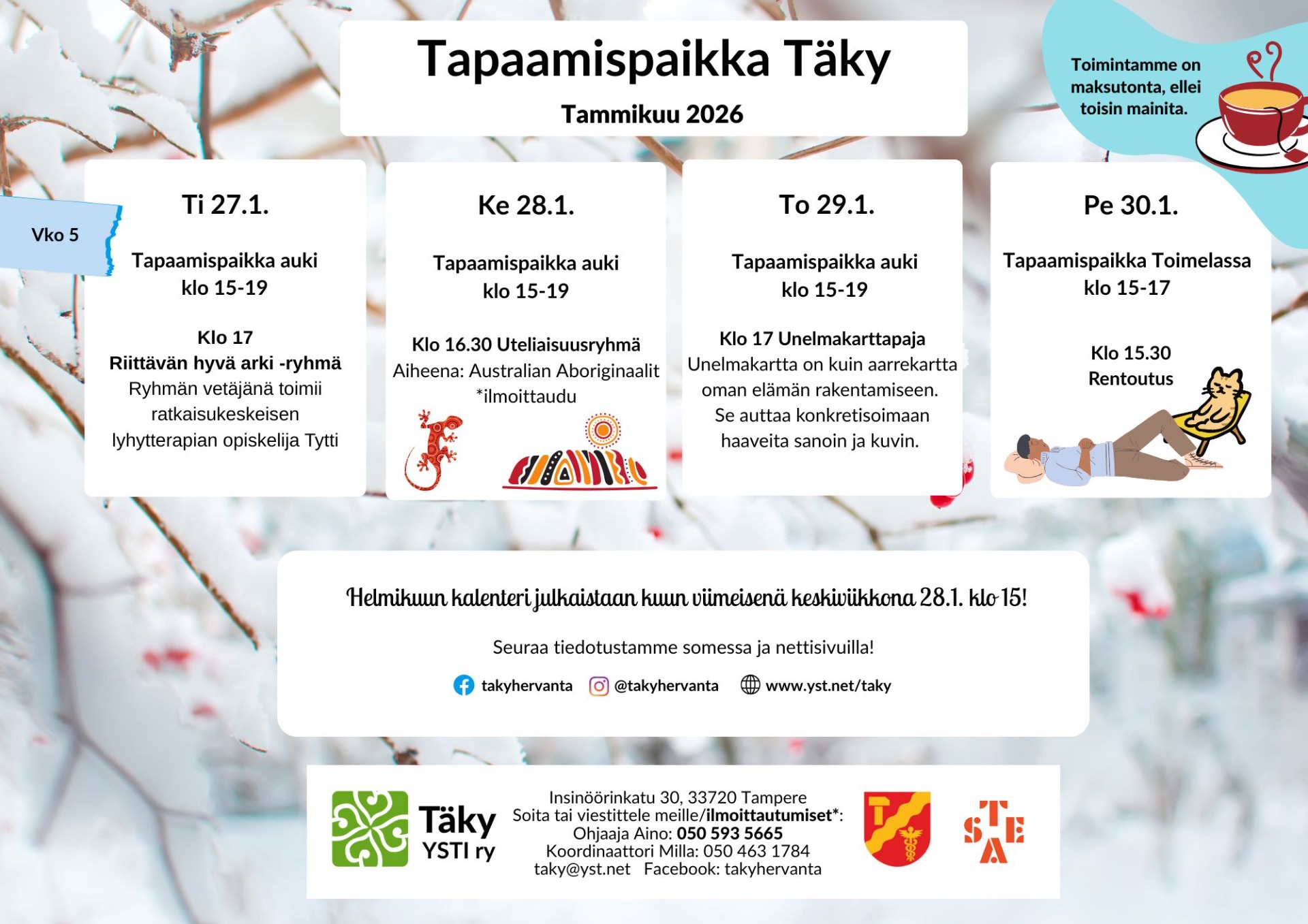 Tammikuussa Täkyssä tapahtuu kaikenlaista vanhaa ja uutta. Täkyn Yhteisöpalaveri on 20.1. Siellä pureudutaan jälleen Täkyn ajankohtaisiin aiheisiin. Tule mukaan vaikuttamaan ja kertomaan ideasi uudelle vuodelle. Yhteisöruokailussa herkutellaan myös pitsalla. Uteliaisuusryhmällä on tammikuussa kolme kokoontumista, jotka ovatkin ryhmän viimeiset, ennen kevään uusia ryhmiä. Luvassa on jälleen laaja kirjo erilaisia kävijöiden toivomia aihealueita.Retki Sara Hildénin taidemuseoon järjestetään perjantaina 23.1. Täky tarjoaa retkellä kahvin/teen retkeläisille. Ilmoittaudu mukaan! La 24.1. on jälleen Toimelassa vaparien pitämä lauantai-aukiolo.Ratkaisukeskeisen lyhytterapian opiskelija Tytti pitää Täkyllä 27.1. alkaen viiden kerran ryhmän aiheesta "Riittävän hyvä arki". Ryhmään mahtuu max. 10 ihmistä, ilmoittaudu viimeistään 20.1. Näiden lisäksi Täkyllä elellään normaalia Täkyn arkea, johon kuuluu luovuutta, visailua ja liikettä, sekä tietysti kahvittelua ja yhdessäoloa! Tervetuloa Täkyilemään!
