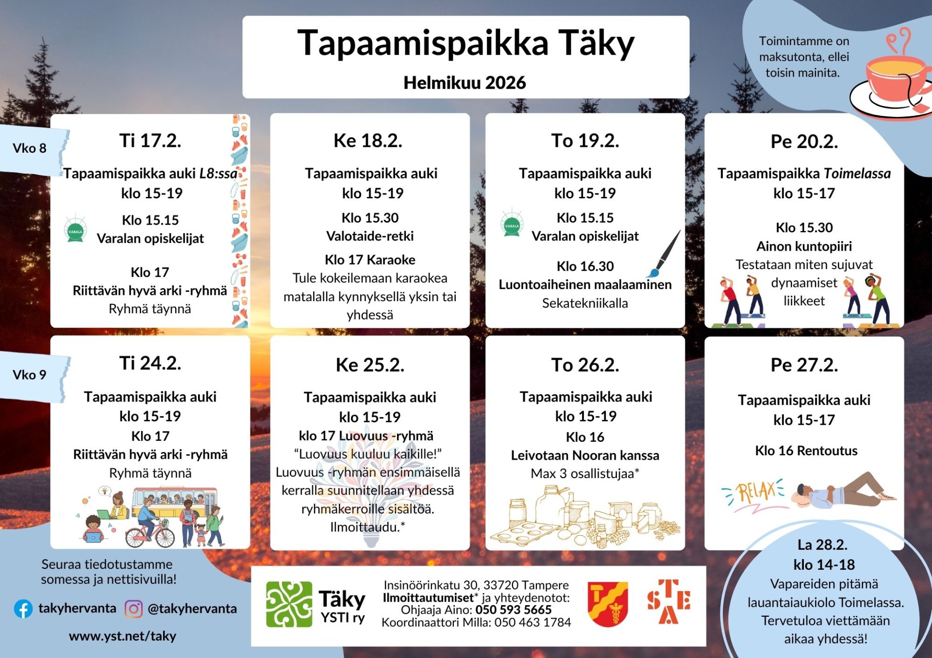 Tammikuussa Täkyllä pidettiin yhteisöpalaveri, jossa päätettiin tämän vuoden kesäretken äänestyskohteet: Helsinki, Porvoo, Vaasa ja Pori. Näistä pääsen äänestämään haluamaasi kohdetta Täkyllä seuraavat kaksi viikkoa. Helmikuussa Täkyllä jatkuu Tytin pitämä Riittävän Hyvä Arki -ryhmä (ryhmä täynnä). Lisäksi meitä ilostuttaa koordinaattorimme Millan pitämä Luovuus-ryhmä, joka starttaa 25.2. Ryhmän slogan on "Luovuus kuuluu kaikille!" Retkiä järjestetään tässä kuussa Kaupin Keilahalliin 6.2., pulkkamäkeen 10.2., sekä metsään "valotaide"-teemalla 18.2.Lisäksi on paljon muita perinteisiä Täky-juttuja, kuten rentoutusta, leivontaa, askartelua, kuntopiiriä ja bingoa. 13.2. Täky osallistuu Arttelin Enemmän Yhdessä -tapahtumaan, tapaamispaikka on tällöin kiinni. Tule ohjaajien kanssa ihmettelemään tapahtumaan, Täkyn pisteeltä löytyy korupaja! Täkyillään taas helmikuussa!