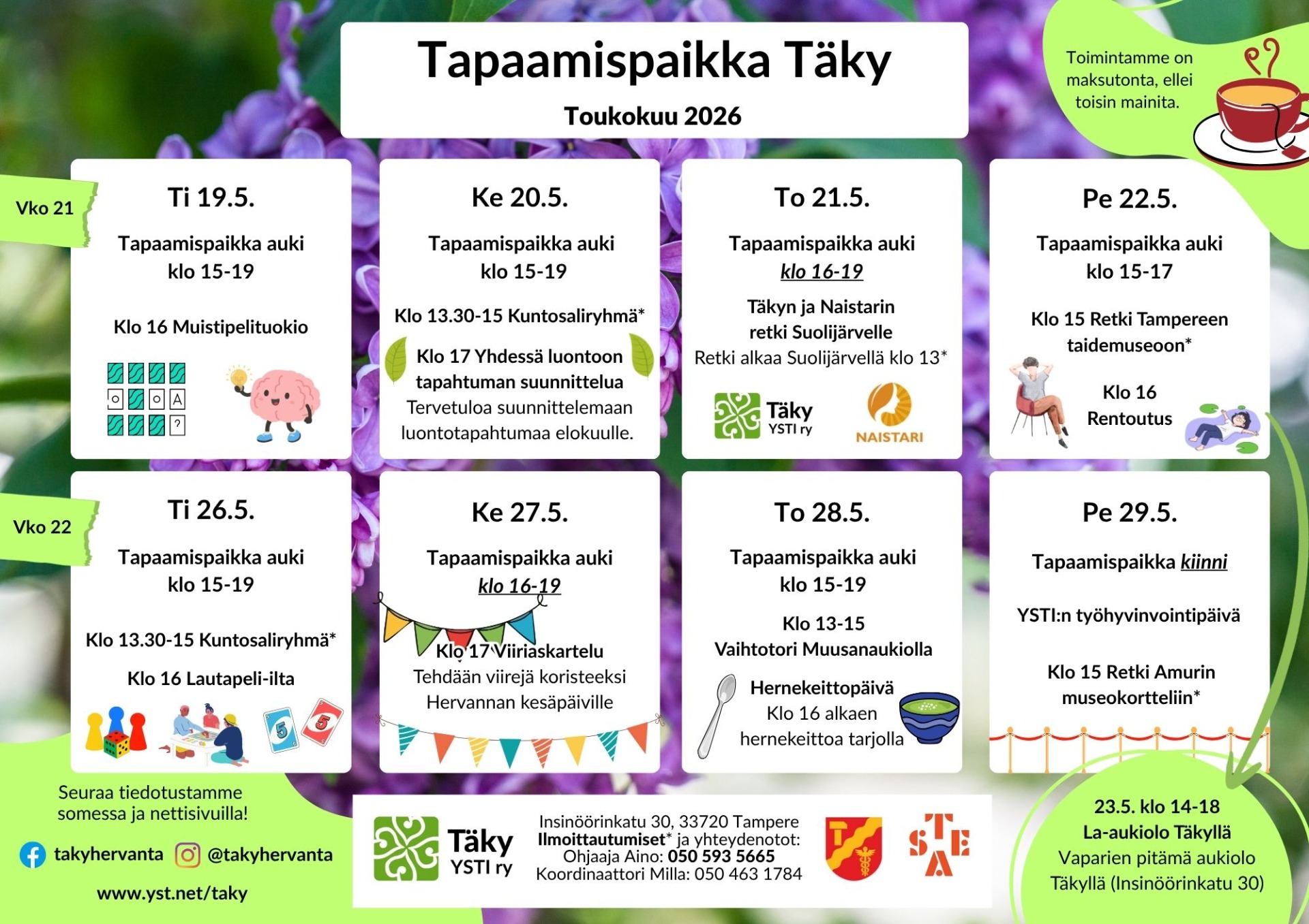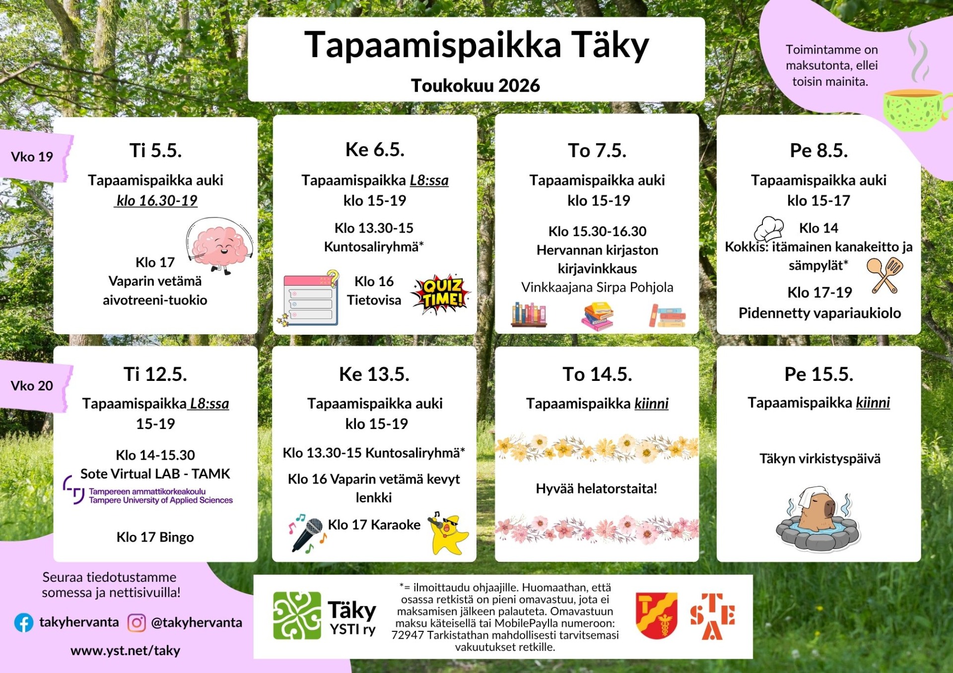 Lisäksi on mm. kokkista, bingoa, tietovisaa, kirjavinkkausta, rentoutusta, sekä hernekeittopäivää. Tervetuloa käymään, nähdään Täkyllä!