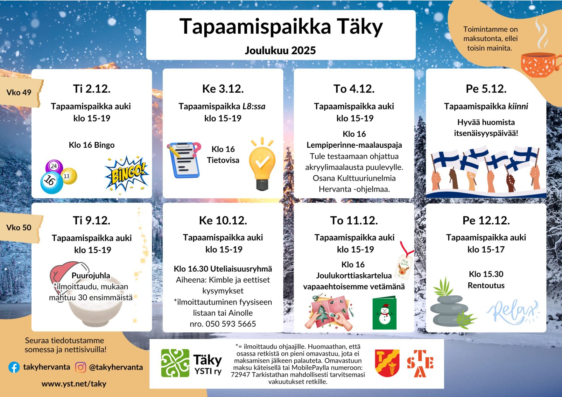 Kulttuuriosuuskunta TIcAS tulee järjestämään Täkylle 4.12. maalauspajan osana Kulttuuriunelmia Hervanta -ohjelmaa. Lisäksi joulukuussa askarrellaan, bingoillaan, rentoudutaan, visaillaan sekä tietysti kahvitellaan. Uteliaisuusryhmä jatkuu aiheella "Kimble ja eettiset kysymykset". Ilmoittautumiset Ainolle nroon +358 50 593 5665. Tervetuloa Täkyilemään!