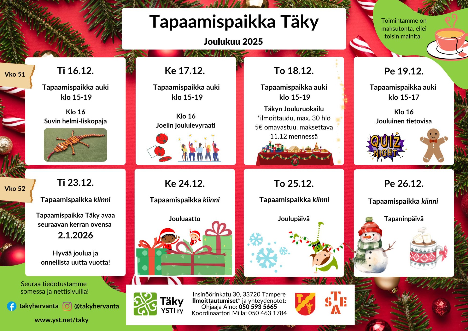 Pitkän tauon jälkeen ilomme on ilmoittaa, TÄKY AUKEAA JÄLLEEN! Ovet aukeavat virallisesti 2.12. klo 15. Täkyn joulukuussa nähdään kaikenlaista ohjelmaa, uutta ja vanhaa. Suurimmat tapahtumat tässä kuussa ovat: Puurojuhla 9.12. Ilmoittaudu, mukaan mahtuu 30 hlö. Täkyn Jouluruokailu 18.12. Ilmoittaudu, omavastuu 5€ on maksettava 11.12. mennessä, mukaan mahtuu 30 hlö.