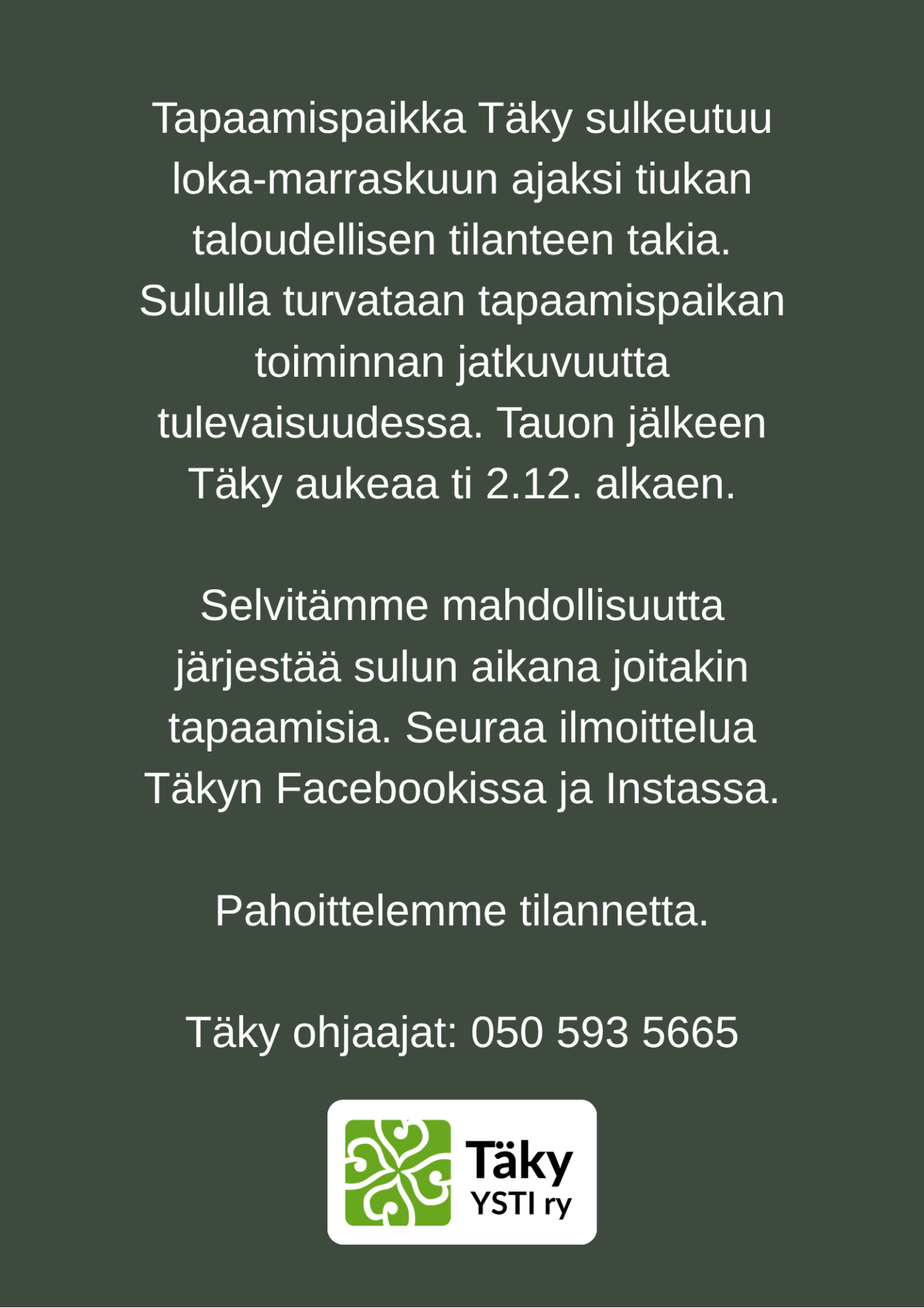 Selvitämme mahdollisuutta järjestää sulun aikana joitakin tapaamisia. Seuraa ilmoittelua Täkyn Facebookissa ja Instassa.