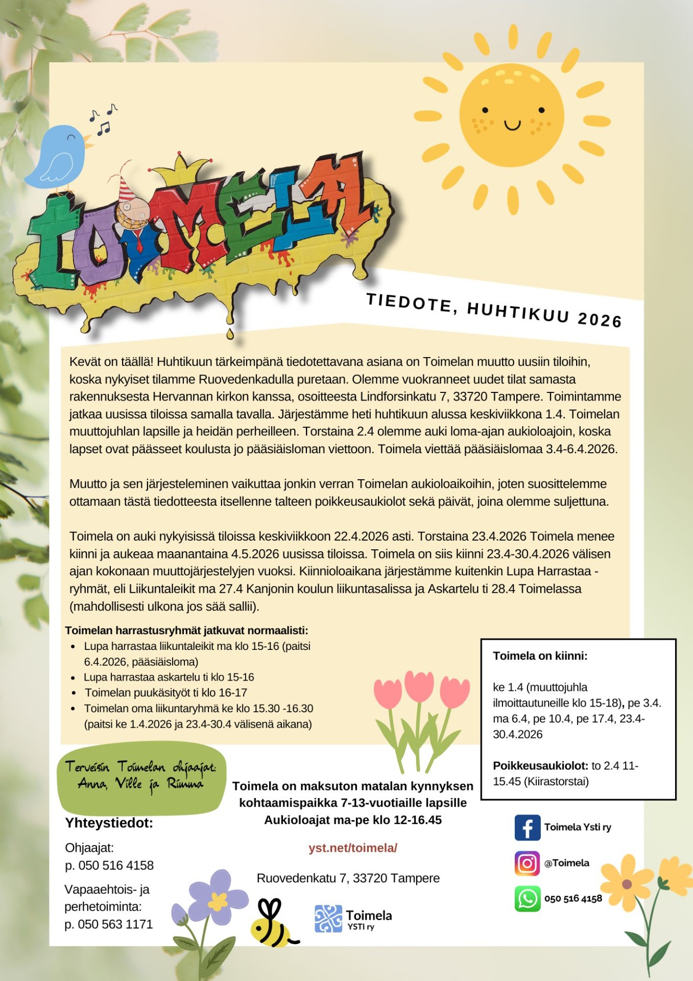 Toimela on auki nykyisissä tiloissa keskiviikkoon 22.4.2026 asti. Torstaina 23.4.2026 Toimela menee kiinni ja aukeaa maanantaina 4.5.2026 uusissa tiloissa. Toimela on siis kiinni 23.4-30.4.2026 välisen ajan kokonaan muuttojärjestelyjen vuoksi. Kiinnioloaikana järjestämme kuitenkin Lupa Harrastaa -ryhmät, eli Liikuntaleikit ma 27.4 Kanjonin koulun liikuntasalissa ja Askartelu ti 28.4 Toimelassa (mahdollisesti ulkona jos sää sallii).Toimelan harrastusryhmät jatkuvat normaalisti: