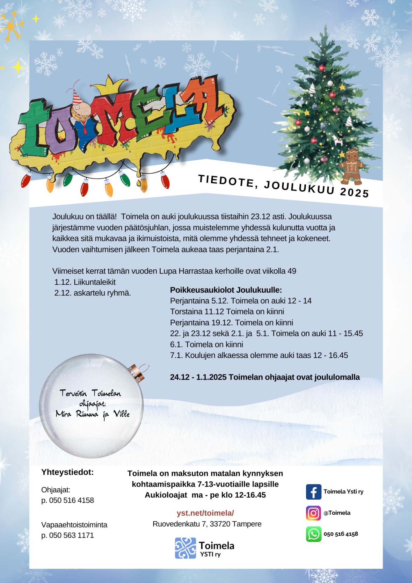 24.12 - 1.1.2025 Toimelan ohjaajat ovat joululomalla