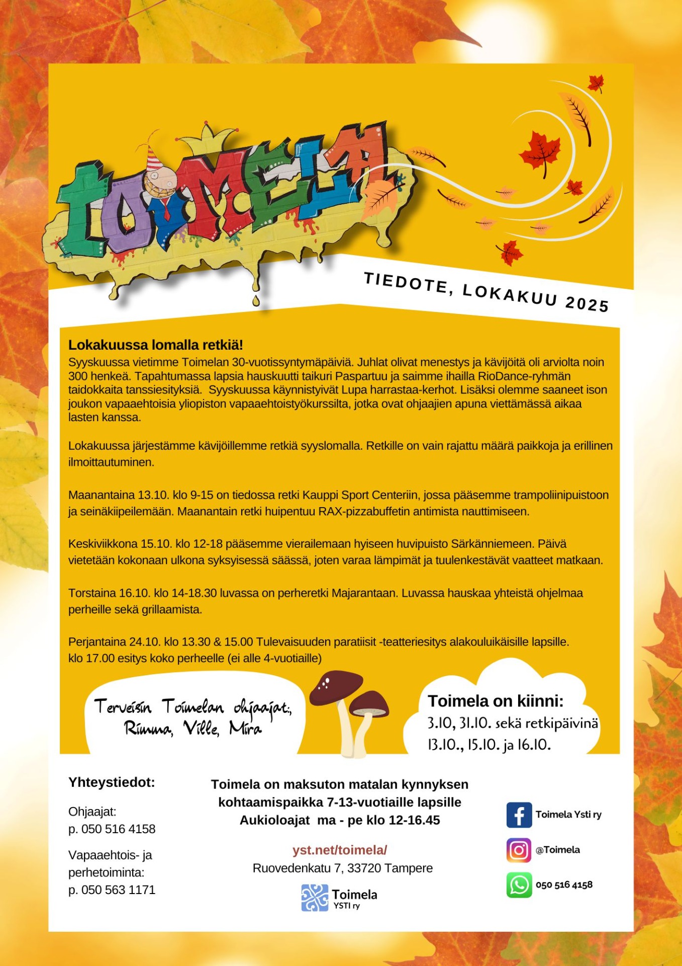 Toimela on kiinni perjantait 3.10. ja 31.10, sekä retkipäivinä syyslomalla 13,10 15,10 ja 16.10.