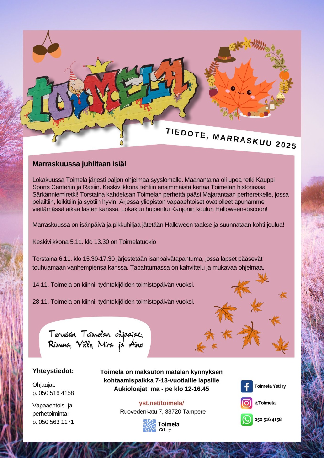 Toimelan lokakuussa oli paljon mukavaa toimintaa. Syyslomalla järjestimme unohtumattomia retkiä Särkänniemeen, Trampoliinipuistoon ja perheretken Majarantaan. Lokakuun lopussa osallistuimme Kanjonin koulun vanhempainyhdistyksen järjestämään halloween-diskoon. Oli todella hauskaa!